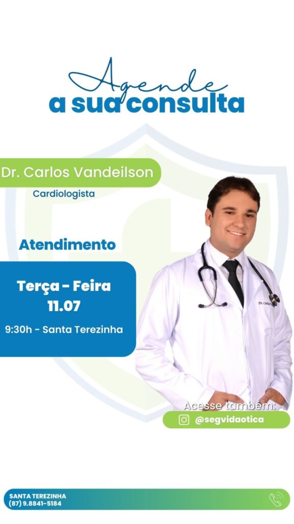 A SegVida em Santa Terezinha informa aos seus clientes e amigos que nesta terça-feira, 11 de julho o Cardiologista Drº Carlos Vandeilson estará atendendo por agendamento a partir das 09:30 da manhã. Reserve sua consulta entrando em contato pelo número (87) 98841-5184.