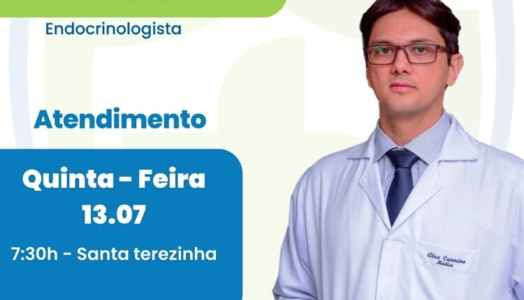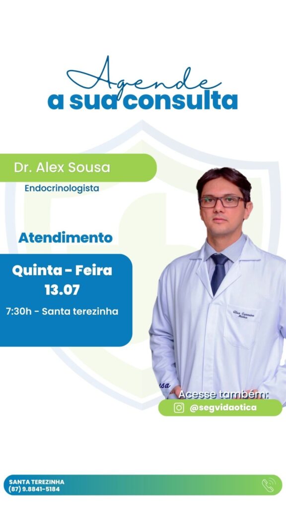 A SegVida em Santa Terezinha informa aos seus clientes e amigos que nesta quinta-feira, 13 de julho o Endocrinologista Drº Alex Sousa estará atendendo por agendamento a partir das 07:30 da manhã. Reserve sua consulta entrando em contato pelo número (87) 98841-5184.