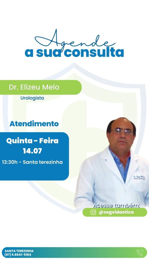 A SegVida em Santa Terezinha informa aos seus clientes e amigos que nesta sexta-feira, 14 de julho o Urologista Drº Elizeu Melo estará atendendo por agendamento a partir das 13:30 horas. Reserve sua consulta entrando em contato pelo número (87) 98841-5184.