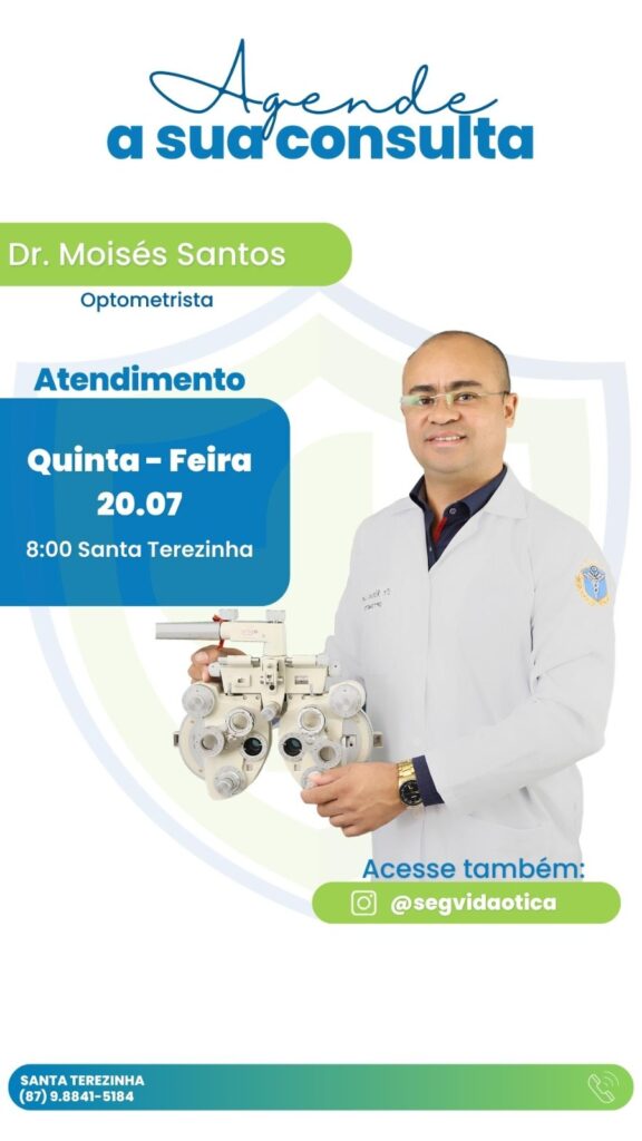 A SegVida em Santa Terezinha comunica aos seus usuários que o Optometrista Drº Moisés Santos estará atendendo por agendamento nesta quinta-feira, 20 de julho a partir das 08:00 horas da manhã. Reserve agora mesmo seu atendimento entrando em contato pelo número (87) 98841-5184.