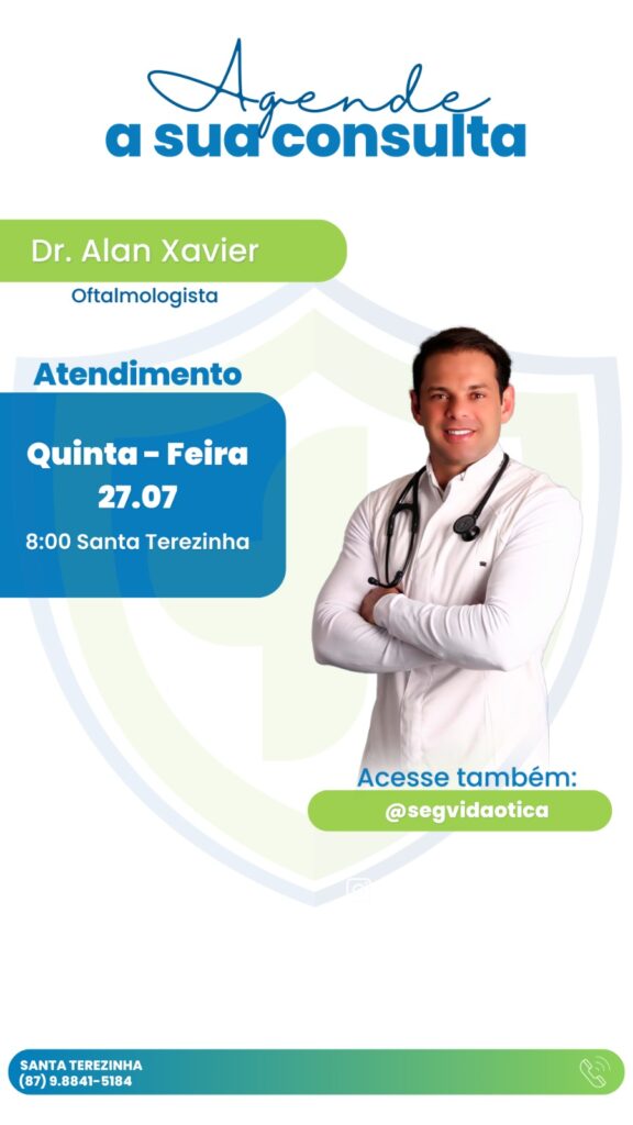 A SegVida em Santa Terezinha comunica aos seus usuários que o Oftalmologista Drº Alan Xavier estará atendendo por agendamento nesta quinta-feira, 27 de julho a partir das 08:00 horas da manhã. Reserve agora mesmo seu atendimento entrando em contato pelo número (87) 98841-5184.