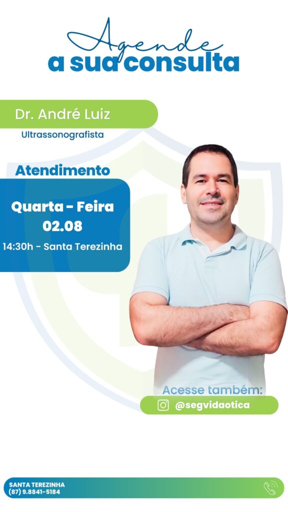 A SegVida em Santa Terezinha comunica aos seus usuários que o Ultrassonografista Drº André Luiz estará atendendo por agendamento nesta quarta-feira, 02 de agosto a partir das 02:30 da tarde. Reserve agora mesmo seu atendimento entrando em contato pelo número (87) 98841-5184.