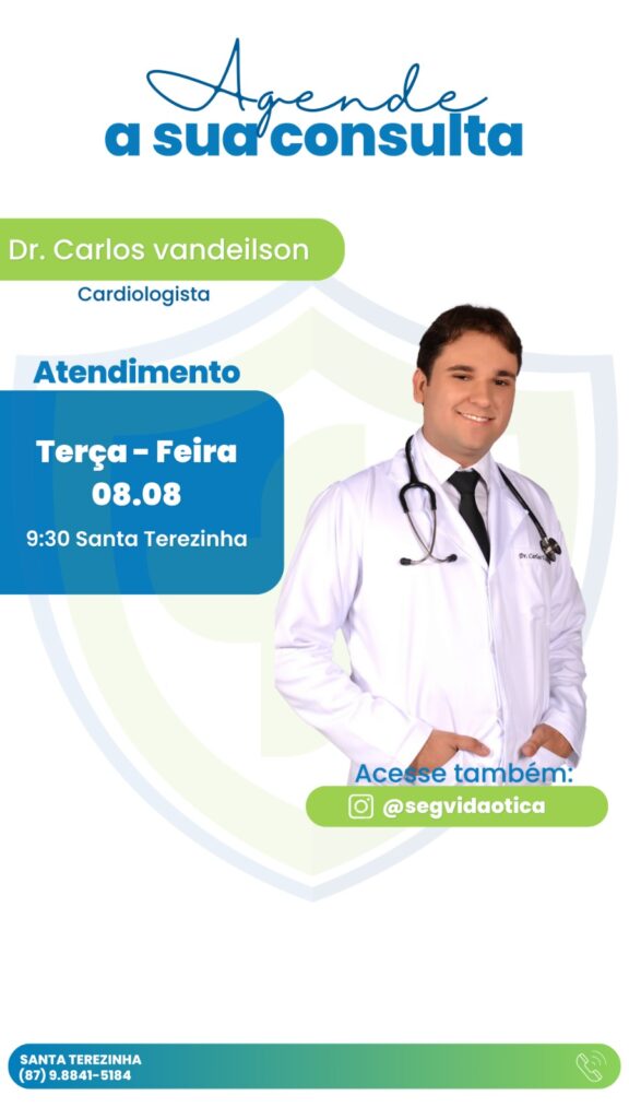 A SegVida em Santa Terezinha comunica aos seus usuários que o Cardiologista Drº Carlos Vandeilson estará atendendo por agendamento nesta terça-feira, 08 de agosto a partir das 09:30 da manhã. Reserve agora mesmo seu atendimento entrando em contato pelo número (87) 98841-5184.