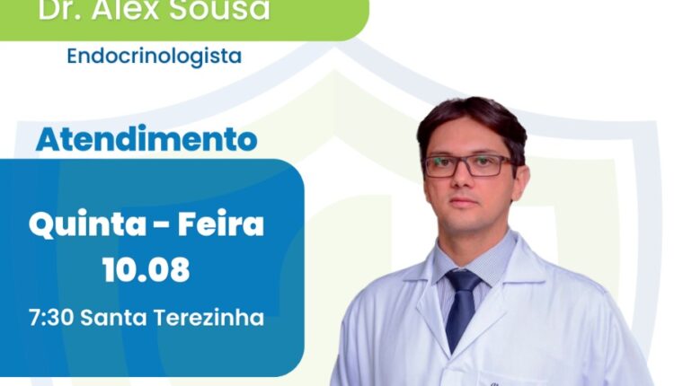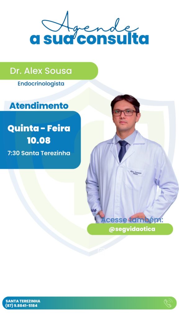 A SegVida em Santa Terezinha informa aos seus clientes e amigos que nesta quinta-feira, 10 de agosto o Endocrinologista Drº Alex Sousa estará atendendo por agendamento a partir das 07:30 da manhã. Reserve sua consulta entrando em contato pelo número (87) 98841-5184.