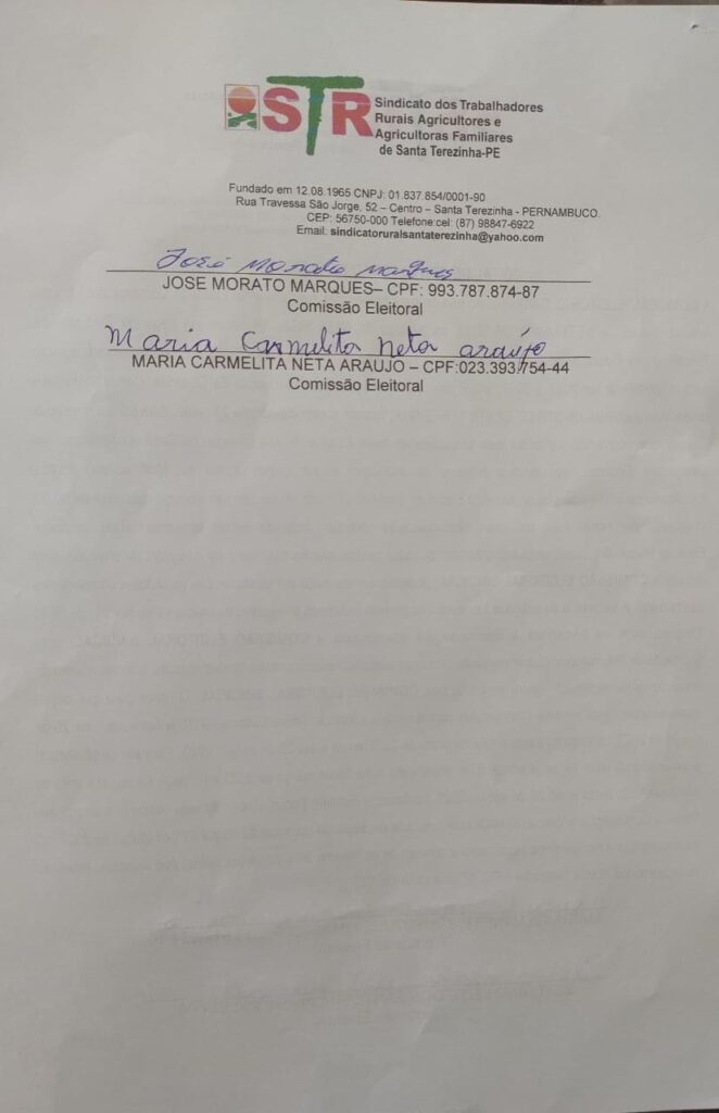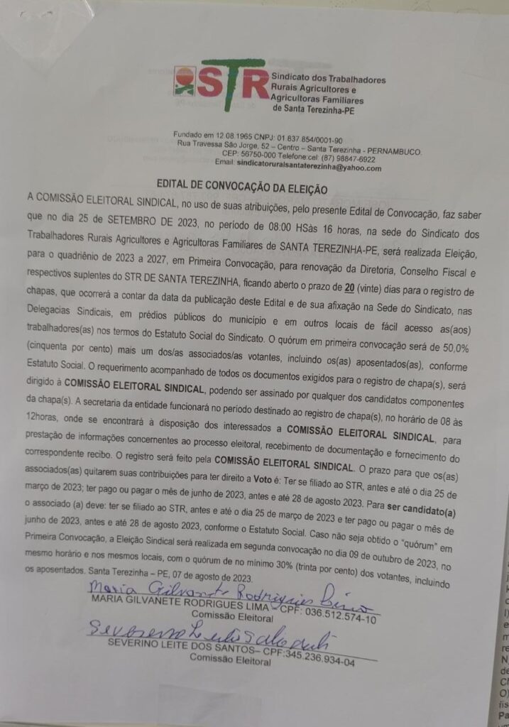 A COMISSÃO ELEITORAL SINDICAL, no uso de suas atribuições, pelo presente Edital de Convocação, faz saber que no dia 25 de SETEMBRO DE 2023, no período de 08:00 HSàs 16 horas, na sede do Sindicato dos Trabalhadores Rurais Agricultores e Agricultoras Familiares de SANTA TEREZINHA-PE, será realizada Eleição, para o quadriênio de 2023 a 2027, em Primeira Convocação, para renovação da Diretoria, Conselho Fiscal e respectivos suplentes do STR DE SANTA TEREZINHA, ficando aberto o prazo de 20 (vinte) dias para o registro de chapas, que ocorrerá a contar da data da publicação deste Edital e de sua afixação na Sede do Sindicato, nas Delegacias Sindicais, em prédios públicos do município e em outros locais de fácil acesso as(aos) trabalhadores(as) nos termos do Estatuto Social do Sindicato. O quórum em primeira convocação será de 50,0% (cinquenta por cento) mais um dos/as associados/as votantes, incluindo os(as) aposentados(as), conforme Estatuto Social. O requerimento acompanhado de todos os documentos exigidos para o registro de chapa(s), será dirigido à COMISSÃO ELEITORAL SINDICAL, podendo ser assinado por qualquer dos candidatos componentes da chapa(s). A secretaria da entidade funcionará no período destinado ao registro de chapa(s), no horário de 08 às 12horas, onde se encontrará à disposição dos interessados a COMISSÃO ELEITORAL SINDICAL, para prestação de informações concernentes ao processo eleitoral, recebimento de documentação e fornecimento do correspondente recibo. O registro será feito pela COMISSÃO ELEITORAL SINDICAL. O prazo para que os(as) associados(as) quitarem suas contribuições para ter direito a Voto é: Ter se filiado ao STR, antes e até o dia 25 de março de 2023; ter pago ou pagar o mês de junho de 2023, antes e até 28 de agosto 2023. Para ser candidato(a) o associado (a) deve: ter se filiado ao STR, antes e até o dia 25 de março de 2023 e ter pago ou pagar o mês de junho de 2023, antes e até 28 de agosto 2023, conforme o Estatuto Social. Caso não seja obtido o “quórum” em Primeira Convocação, a Eleição Sindical será realizada em segunda convocação no dia 09 de outubro de 2023, no mesmo horário e nos mesmos locais, com o quórum de no mínimo 30% (trinta por cento) dos votantes, incluindo os aposentados. Santa Terezinha – PE, 07 de agosto de 2023.