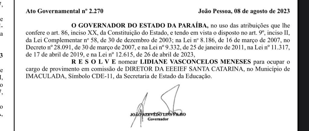 O governador da Paraíba João Azevedo nomeou a senhora Lidiane Vasconcelos Meneses para ocupar o cargo de Diretora da Escola Estadual Santa Catarina no Distrito de Palmeira. A desição do governador foi publicada no Diário Oficial dessa terça-feira, 08 de agosto.