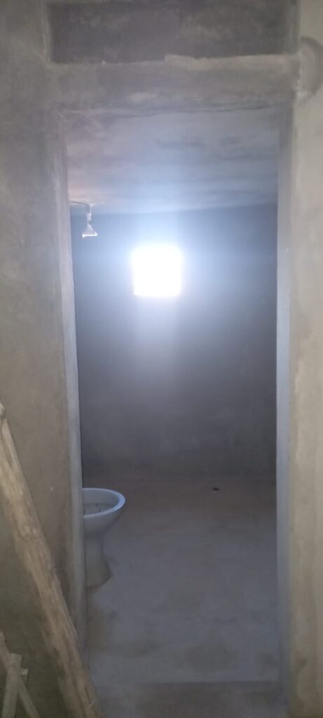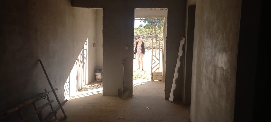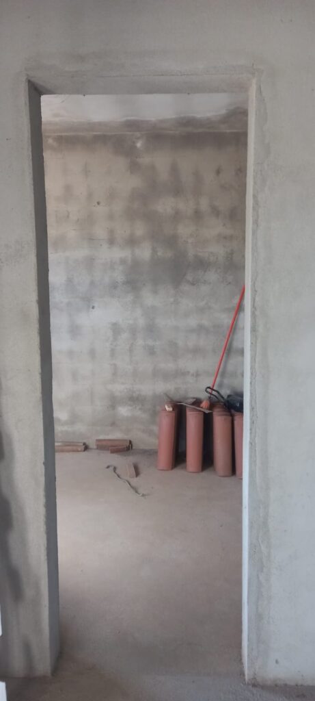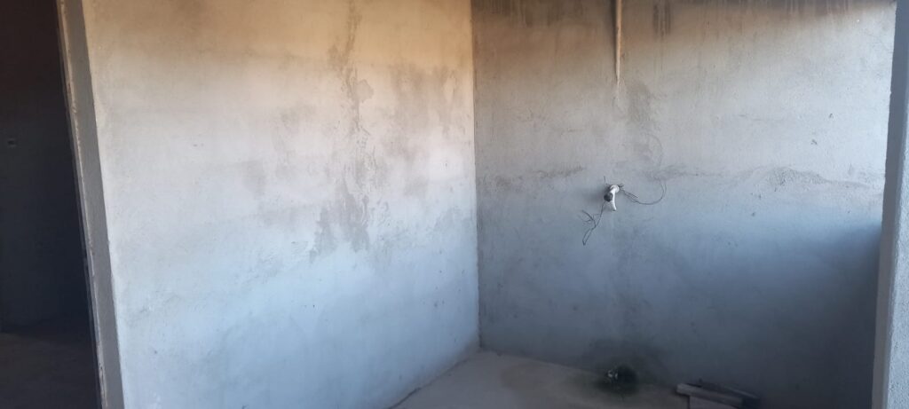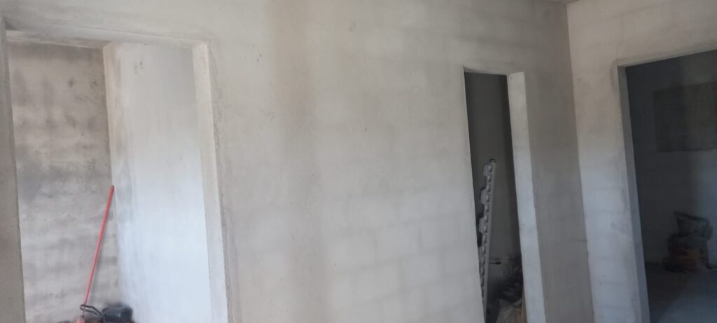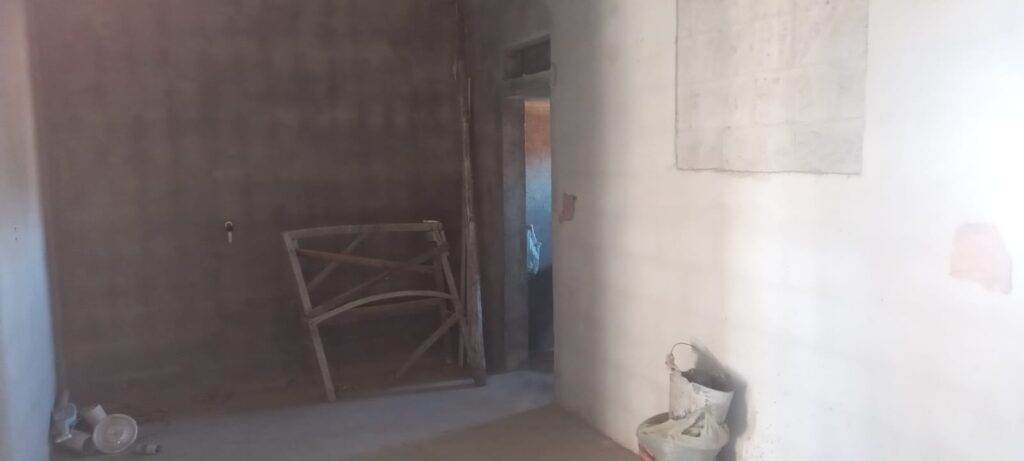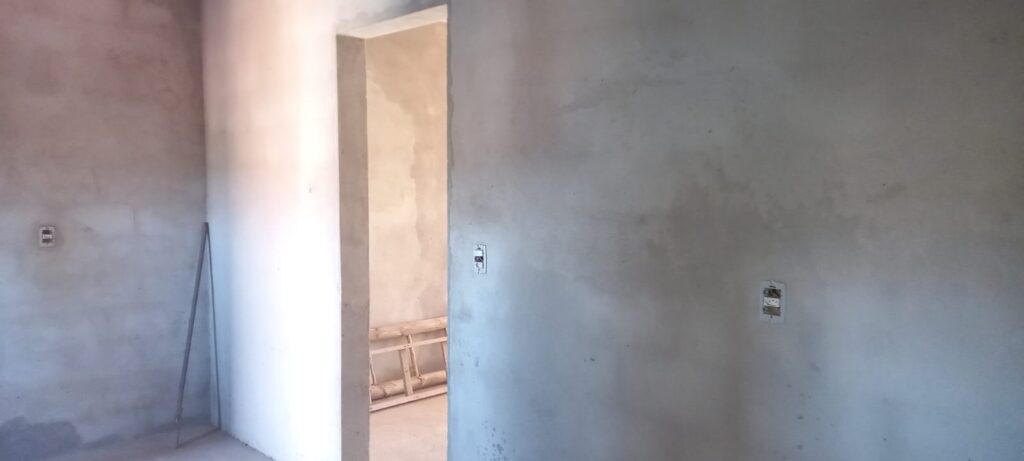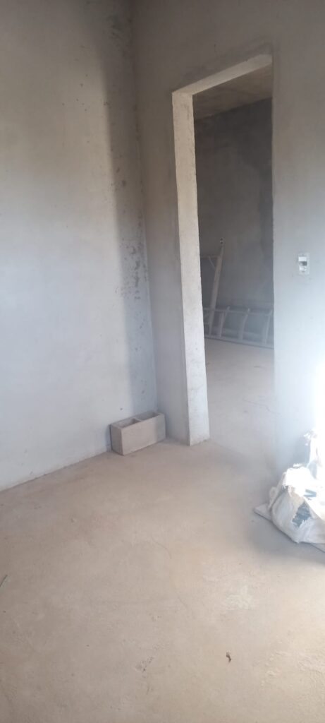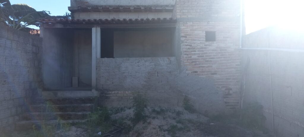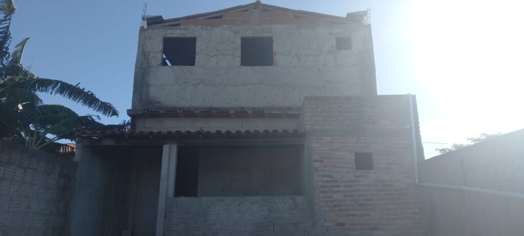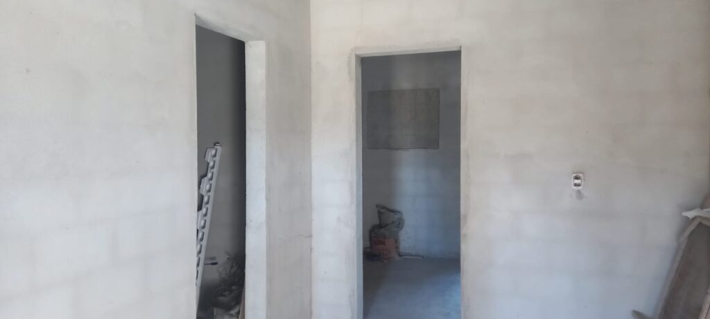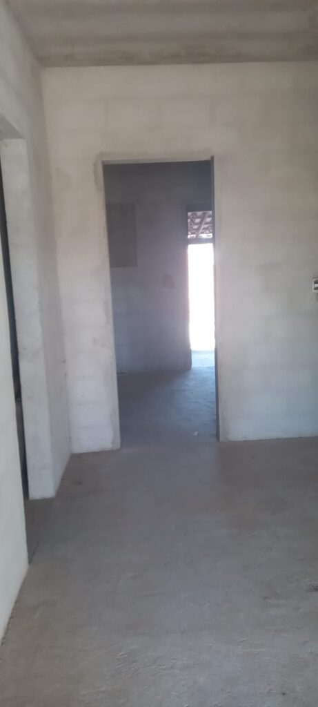 Em baixo a casa tem uma área na frente, uma sala, dois quartos, uma cozinha, um banheiro e uma área de serviços. Um muro com uma pequena cistena. Toda a casa na parte de baixo está rebocada e é na laje e já está em ponto de receber cerâmica no piso, inclusive nas paredes do banheiro. A parte de cima já está começada.