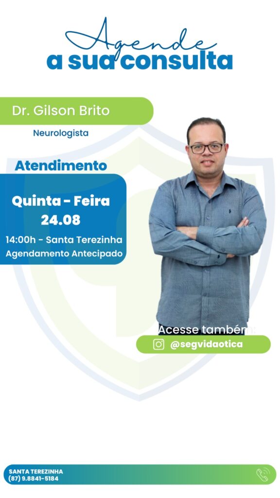 A SegVida em Santa Terezinha comunica aos seus usuários que o Neurologista Drº Gilson Brito estará atendendo por agendamento nesta quinta-feira, 24 de agosto a partir das 14:00 horas. Reserve agora mesmo seu atendimento entrando em contato pelo número (87) 98841-5184.