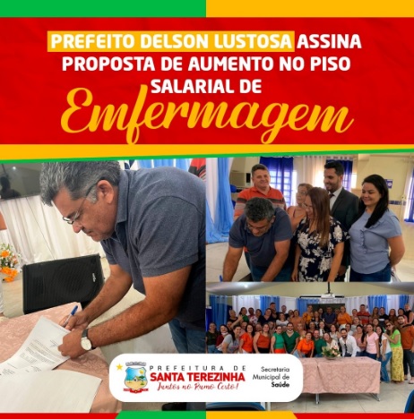Em reunião na manhã desta sexta-feira, 01 de setembro o prefeito de Santa Terezinha Delson Lustosa, ao lado do vice Dada de Adeval assinou a proposta de aumento no Piso Salarial da Enfermagem. Este piso foi instituído pela Lei Federal nº 14.434/2022. O documento orienta que enfermeiros receberão R$ 4.750,00; técnicos de enfermagem, R$ 3.325,00; auxiliares de enfermagem e parteiras, R$ 2.375,00.