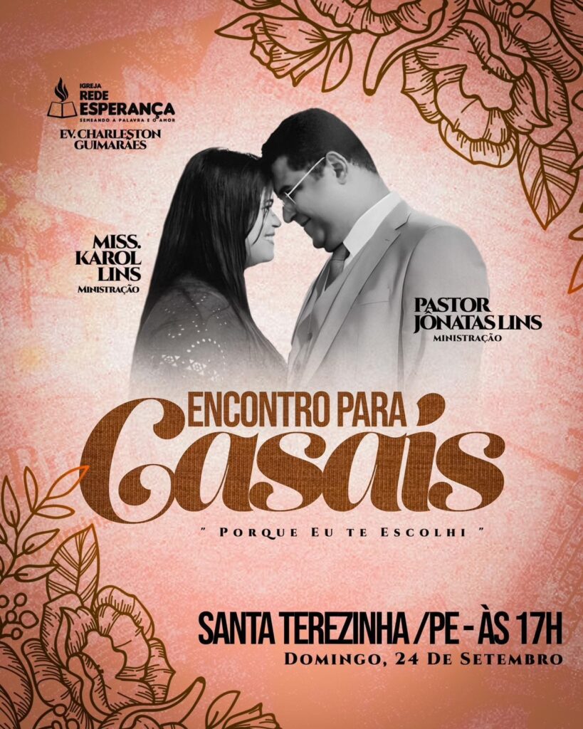 A Igreja Evangélica Rede Esperança, pastoreada pelo Pastor Charleston Guimarães, realizou neste último domingo dia 24.09.2023 O Encontro de Casais na Chácara de Gedilson, zona rural de Santa Terezinha – PE. com o tema: “PORQUE EU TE ESCOLHI”, com louvores gospel romântico, palestra bíblica e dinâmica.