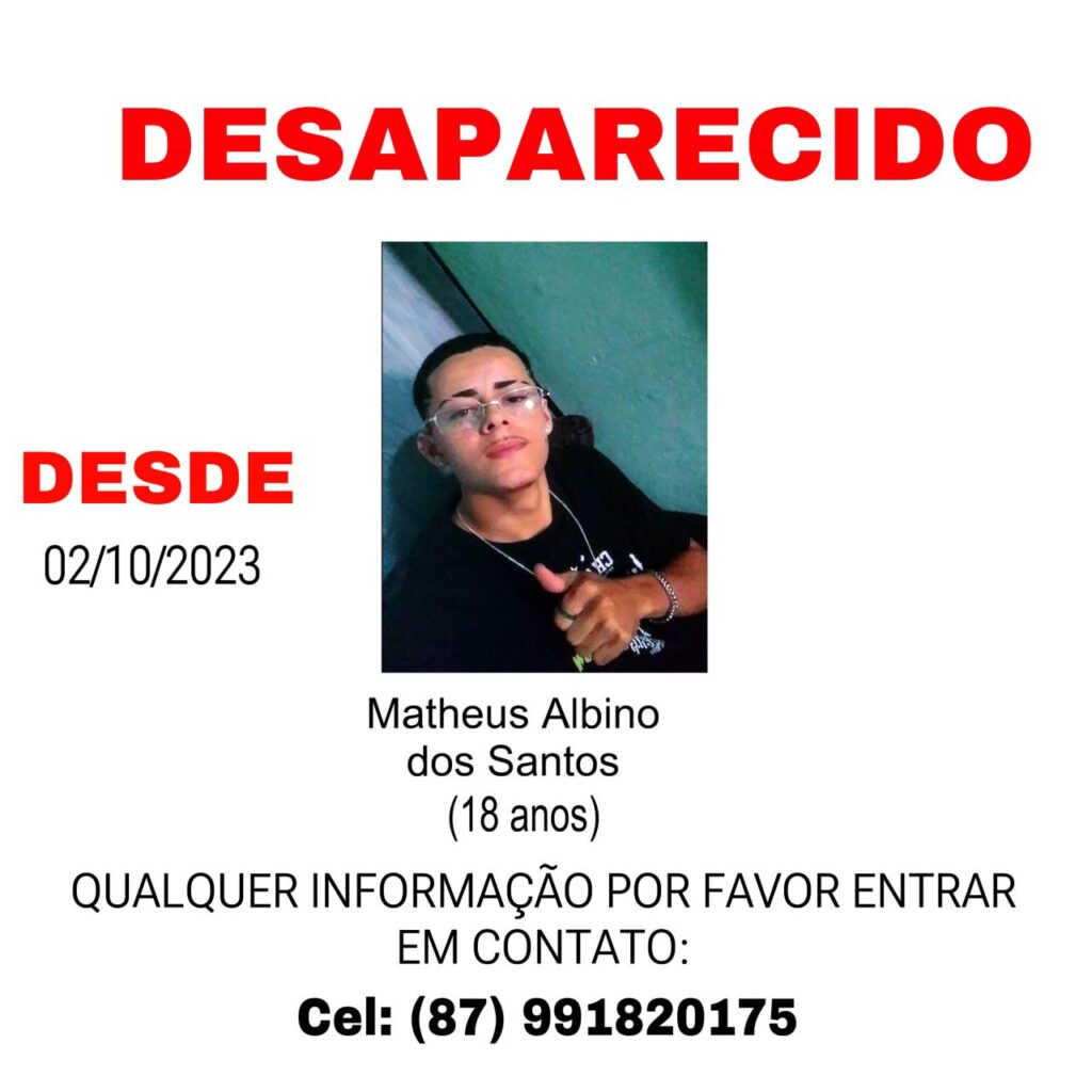 No começa da tarde desta quarta-feira, 05 de outubro a família do jovem Matheus Albino dos Santos de 18 anos entrou em contato com a redação do blog informando que ele saiu de casa junto com sua esposa na última segunda-feira (02) da casa da mãe com distino a residência de sua sogra. Segundo a família dele, houve um desentedimento entre o casal por conta de mensagens em aplicativo de celular. Ele saiu dizendo que ia voltar para casa de sua mãe, mas até o momento ele não apareceu, nem deu notícias.