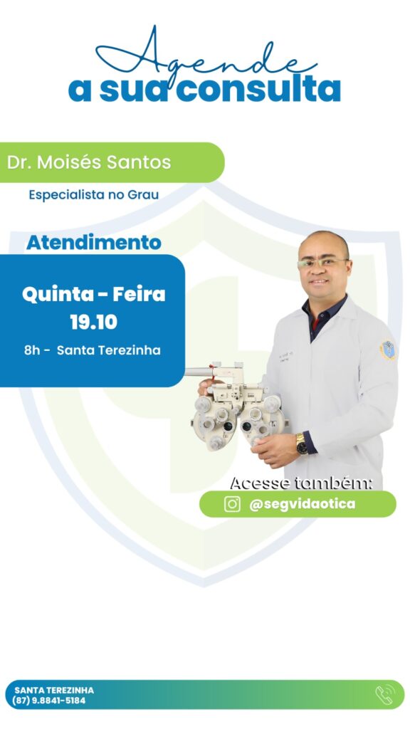 A SegVida em Santa Terezinha comunica aos seus usuários que o Optometrista Drº Moisés Santos estará atendendo por agendamento no dia 19 de outubro a partir das 08:00 horas da manhã. Reserve agora mesmo seu atendimento entrando em contato pelo número (87) 98841-5184.
