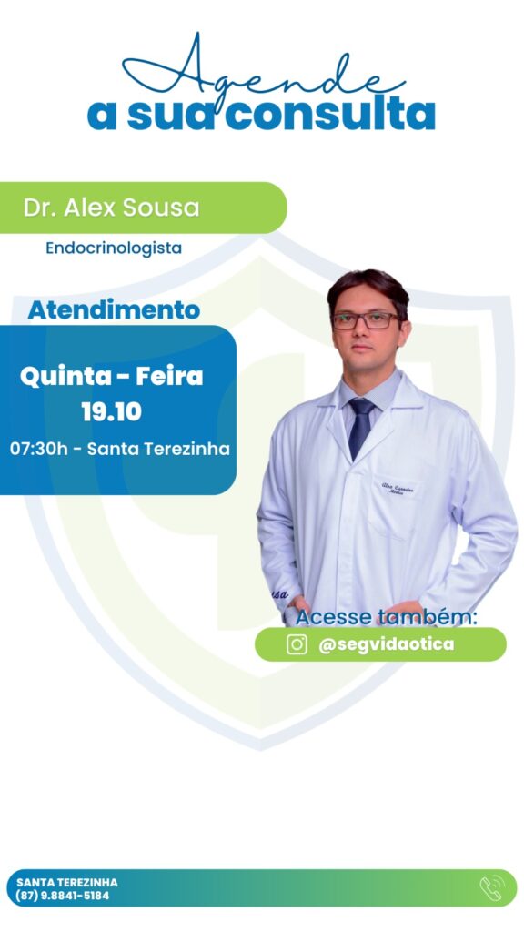 A SegVida em Santa Terezinha informa aos seus clientes e amigos que nesta quinta-feira, 19 de outubro o Endocrinologista Drº Alex Sousa estará atendendo por agendamento a partir das 07:30 da manhã. Reserve sua consulta entrando em contato pelo número (87) 98841-5184.