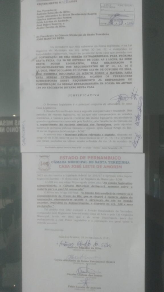 Os vereadores Couro de Zuca Preto, Carlinhos Policial, Charles Lustosa, Fabinho de Chico França, Dejaci Cabelinho e Júnior de Branco, protocolaram requerimento nesta terça-feira, 17 de outubro ao presidente do legislativo Terezinhense Neguinho de Danda, solicitando uma Sessão Extraordinária para deliberar, exclusivamente, sobre requerimento protocolado no início deste mês.