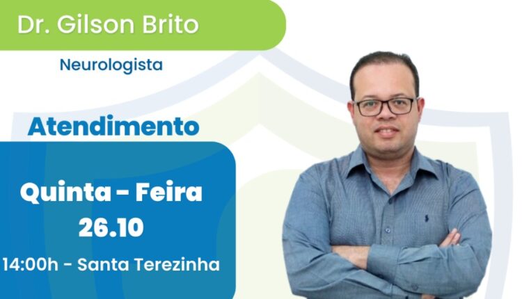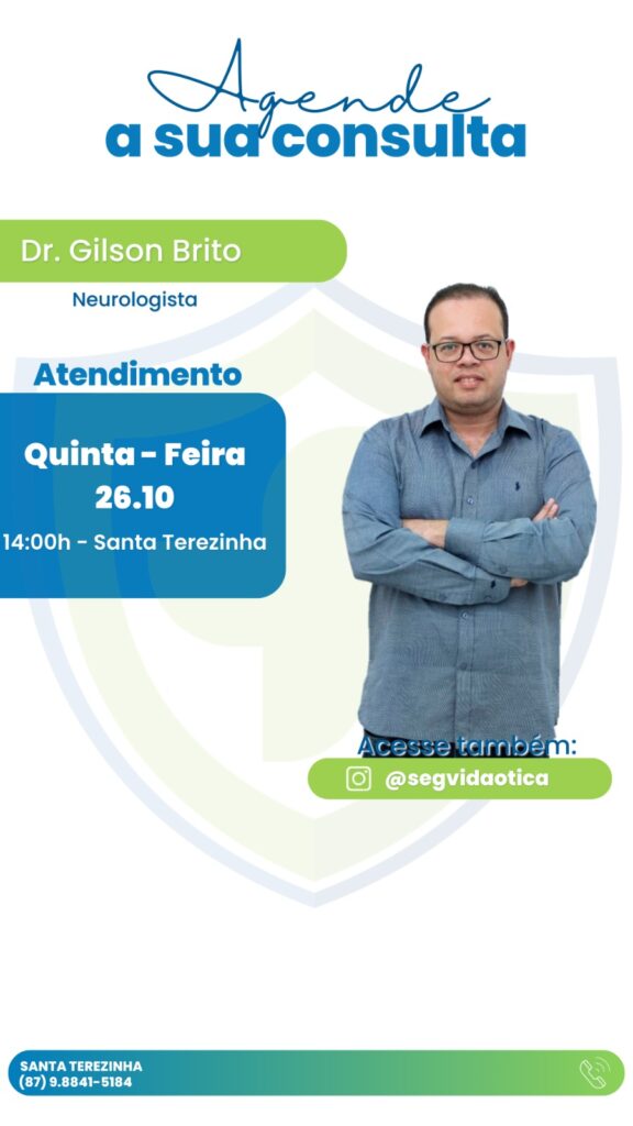 A SegVida em Santa Terezinha comunica aos seus usuários que o Neurologista Drº Gilson Brito estará atendendo por agendamento nesta quinta-feira, 26 de outubro a partir das 14:00 horas. Reserve agora mesmo seu atendimento entrando em contato pelo número (87) 98841-5184.