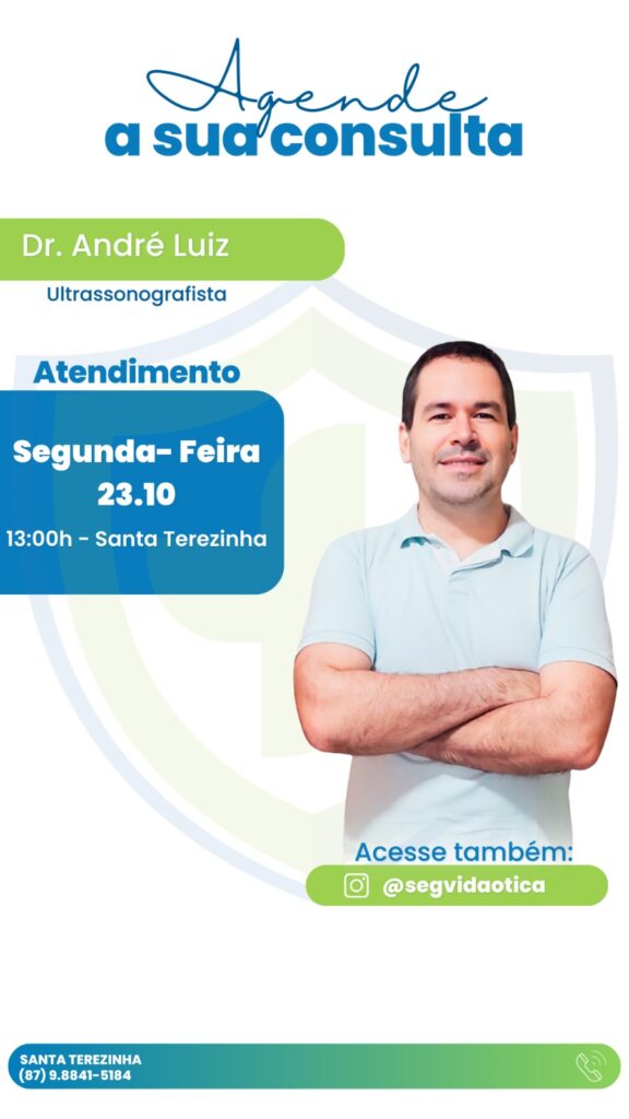 A SegVida em Santa Terezinha comunica aos seus usuários que o Ultrassonografista Drº André Luiz estará atendendo por agendamento nesta segunda-feira, 23 de outubro a partir das 13:00 horas. Reserve agora mesmo seu atendimento entrando em contato pelo número (87) 98841-5184.