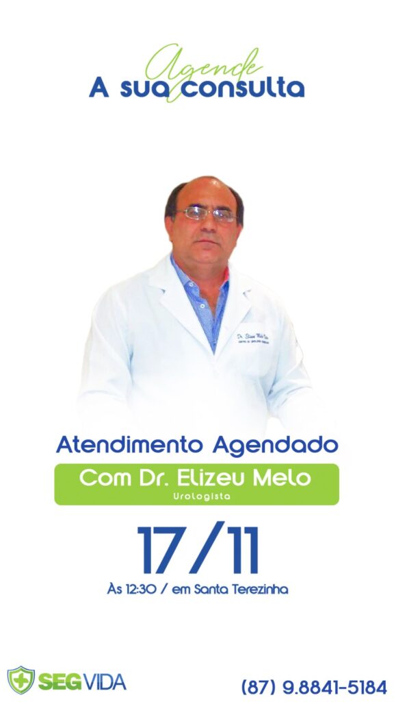 A SegVida em Santa Terezinha comunica aos seus usuários que nesta sexta-feira, 17 de novembro o Urologista Drº Elizeu Melo estará atendendo por agendamento antecipado a partir do meio dia em meia. Reserve hoje mesmo sua vaga entranto em contato pelo número (87) 98841-5184.