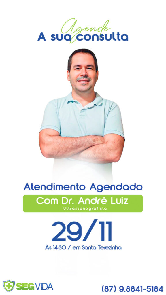 A SegVida em Santa Terezinha comunica aos seus usuários que o Ultrassonografista Drº André Luiz estará atendendo por agendamento nesta quarta-feira, 29 de novembro a partir das 14:30 horas. Reserve agora mesmo seu atendimento entrando em contato pelo número (87) 98841-5184.