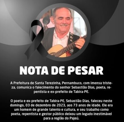 A Prefeitura de Santa Terezinha divulgou Nota Oficial lamentado a morte do poeta Sebastião Dias, se juntando ao luto regional na perca do artísta. O poeta faleceu na tarde desse domingo (03.12) no Hospital do Sertão do Cariri aos 73 anos. A nota da família diz que a morte ocorreu às às 13 horas, no Hospital do Coraçãona cidade de Barbalha.