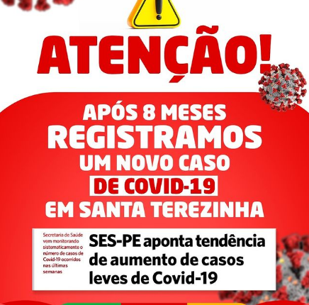 Após oito meses, a Secretaria Municipal de Saúde de Santa Terezinha, confirmou um caso de Covid-19 no município. A secretaria vem nonitorando a situação da pandemia e reforça para os Terezinhenses que ainda não completaram o esquema vacinal para que procurem as unidades de Saúde para vacinarem-se.