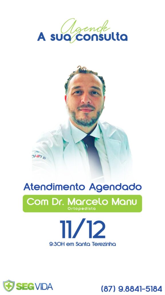 A SegVida em Santa Terezinha comunica aos seus usuários que o Ortopedista Drº Marcelo Manu estará atendendo por agendamento nesta segunda-feira, 11 de dezembro. Os atendimentos cemeçaram às 09:30 da manhã. Reserve agora mesmo seu atendimento entrando em contato pelo número (87) 98841-5184.