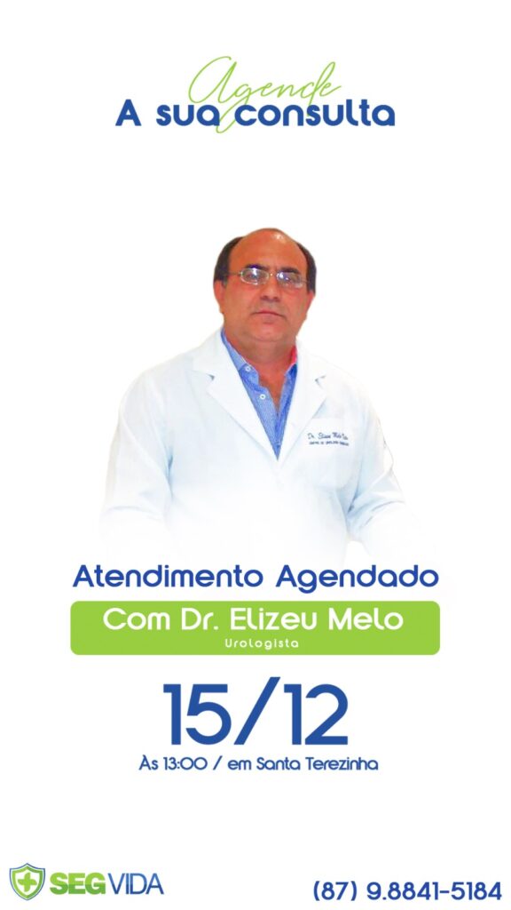 A SegVida em Santa Terezinha comunica aos seus usuários que nesta sexta-feira, 15 de dezembro o Urologista Drº Elizeu Melo estará atendendo por agendamento antecipado a partir das 15:00 horas. Reserve hoje mesmo sua vaga entranto em contato pelo número (87) 98841-5184.