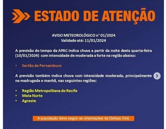m comunicado emitido no final da tarde desta quarta-feira (10) pela Agência Pernambucana de Águas e Clima (Apac) alerta para a probabilidade da queda de fortes pancadas de chuva no Sertão do Estado nesta quinta-feira (11).