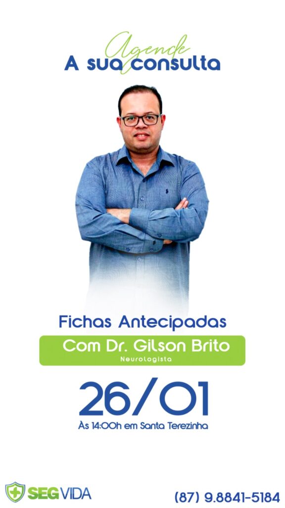 A SegVida em Santa Terezinha comunica aos seus usuários que o Neurologista Drº Gilson Brito estará atendendo por agendamento nesta sexta-feira, 26 de dezembro a partir das 14:00 horas. Reserve agora mesmo seu atendimento entrando em contato pelo número (87) 98841-5184.