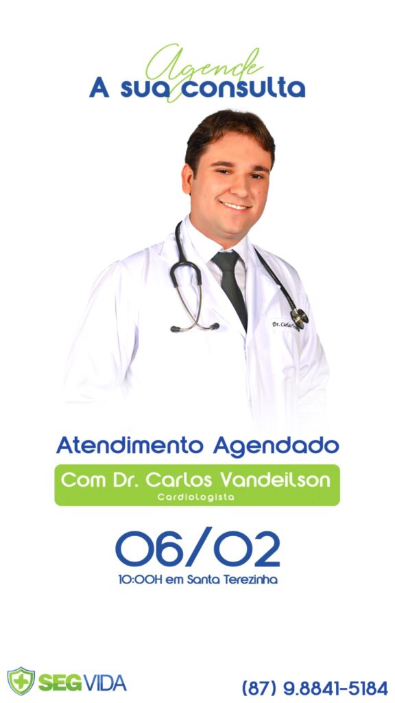 A SegVida em Santa Terezinha comunica aos seus usuários que o Cardiologista Drº Carlos Vandeilson estará atendendo por agendamento nesta terça-feira, 06 de fevereiro a partir das 10:00 horas da manhã. Reserve agora mesmo seu atendimento entrando em contato pelo número (87) 98841-5184.
