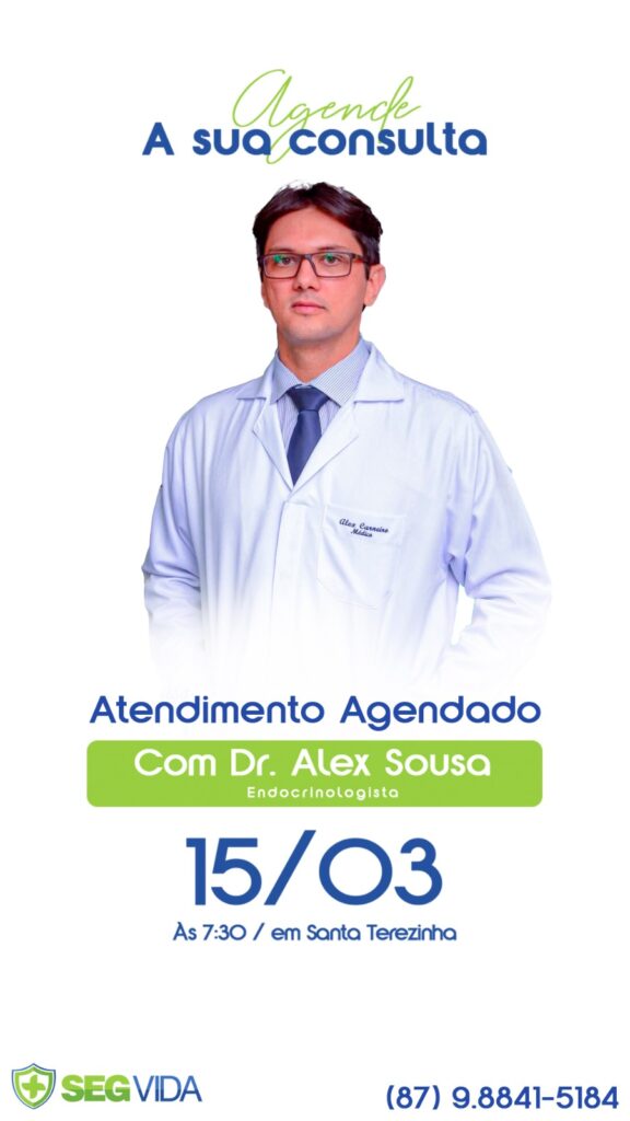 A SegVida em Santa Terezinha informa aos seus clientes e amigos que nesta sexta-feira, 15 de março o Endocrinologista Drº Alex Sousa estará atendendo por agendamento a partir das 07:30 da manhã. Reserve sua consulta entrando em contato pelo número (87) 98841-5184.