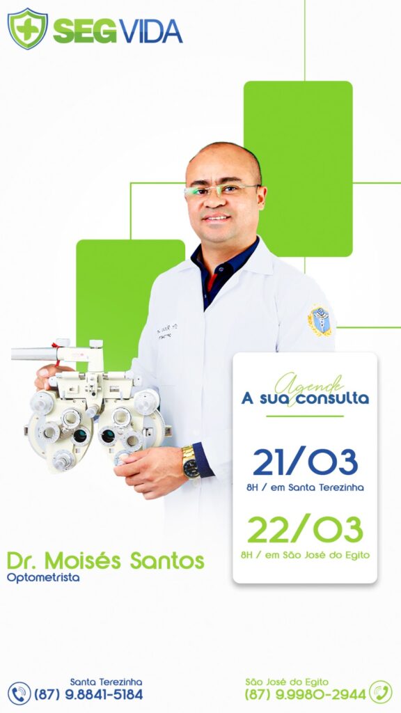 A SegVida em Santa Terezinha comunica aos seus usuários que o Optometrista Drº Moisés Santos estará atendendo por agendamento nesta quinta-feira, 21 de março a partir das 08:00 horas da manhã. Reserve agora mesmo seu atendimento entrando em contato pelo número (87) 98841-5184.