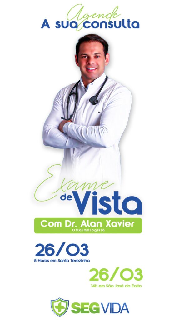 A SegVida em Santa Terezinha comunica aos seus usuários que o Oftalmologista Drº Alan Xavier estará atendendo por agendamento nesta terça-feira, 26 de março a partir das 08:00 horas da manhã. Reserve agora mesmo seu atendimento entrando em contato pelo número (87) 98841-5184.