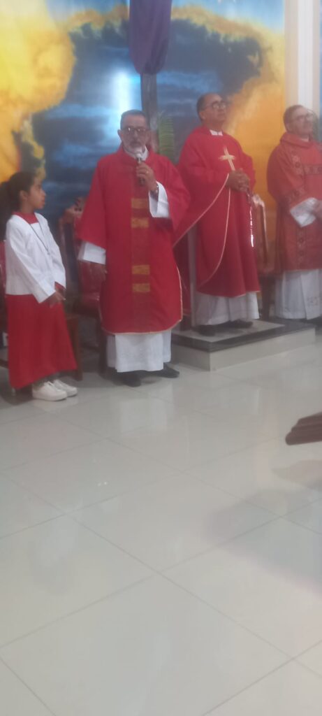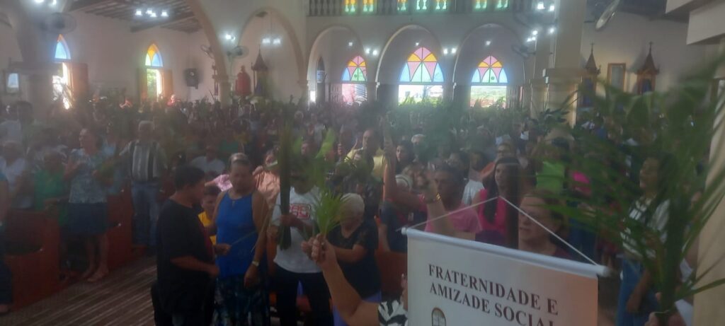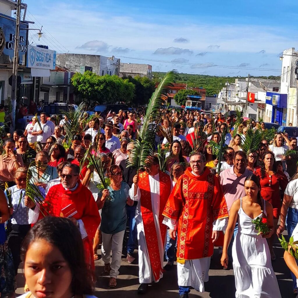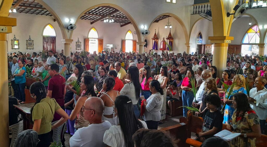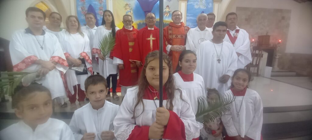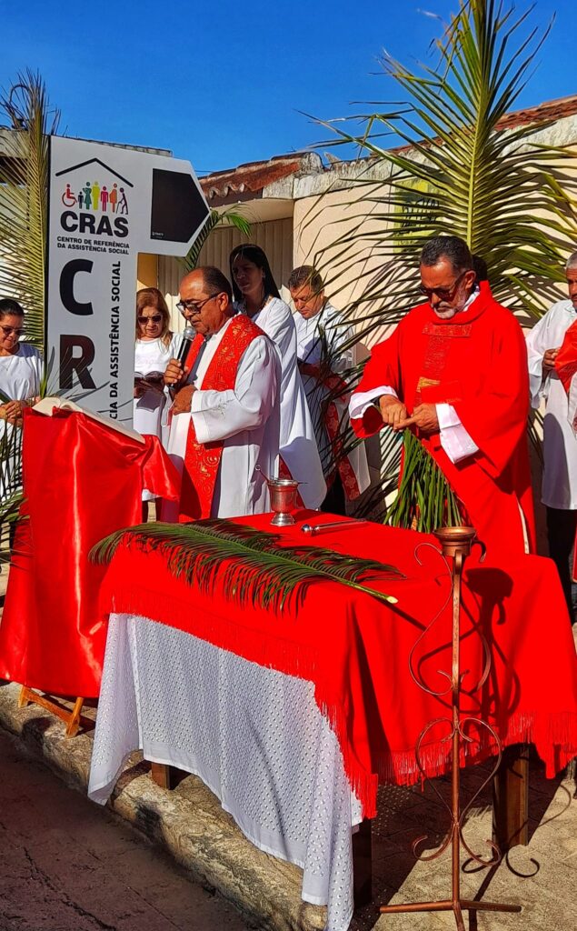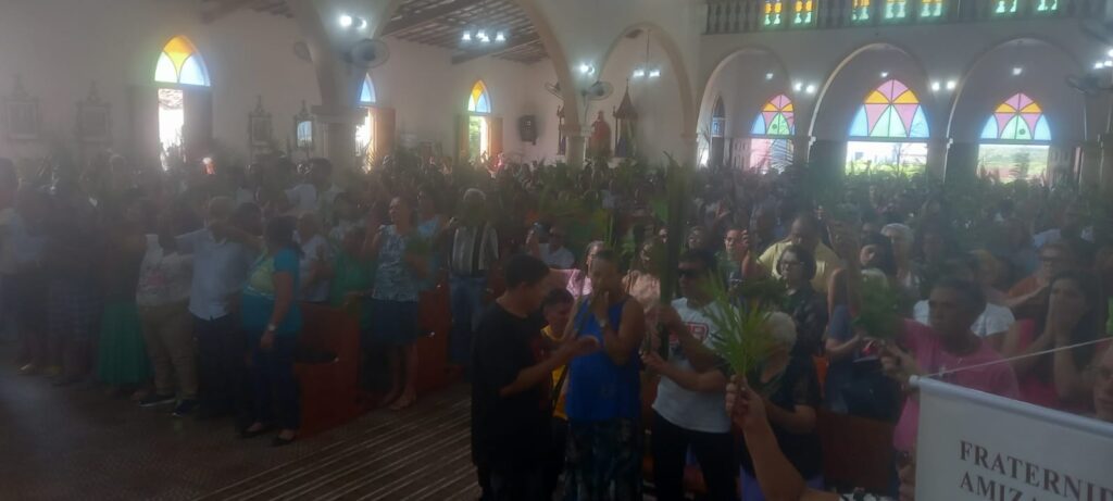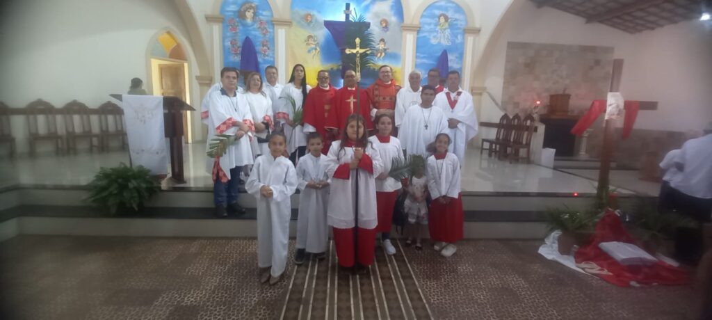 O padre Orlando presidiu a celebração com os diáconos Eduardo Oliveira e Edcarlos Soares. Cristo não é um Rei deste mundo, então o Domingo de Ramos dá o início à Semana Santa, que mistura os gritos de hosanas com os clamores da Paixão de Cristo. Naquele tempo o povo acolheu Jesus abanando seus ramos de oliveiras e palmeiras.