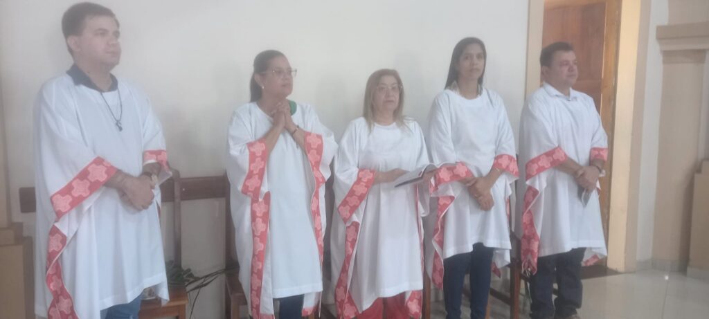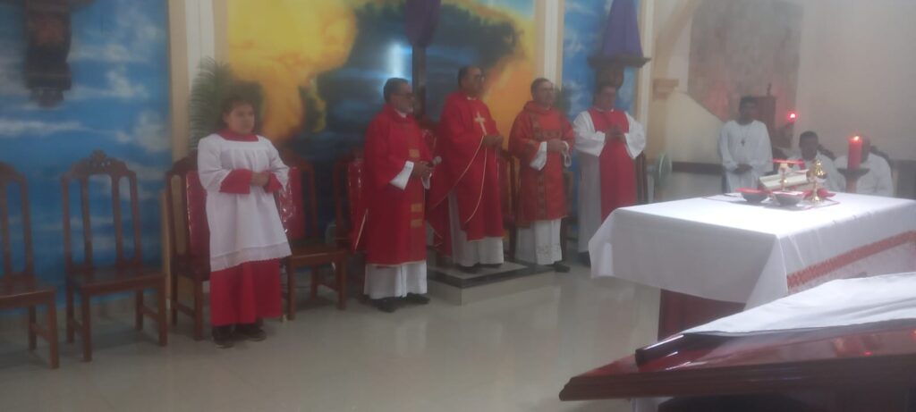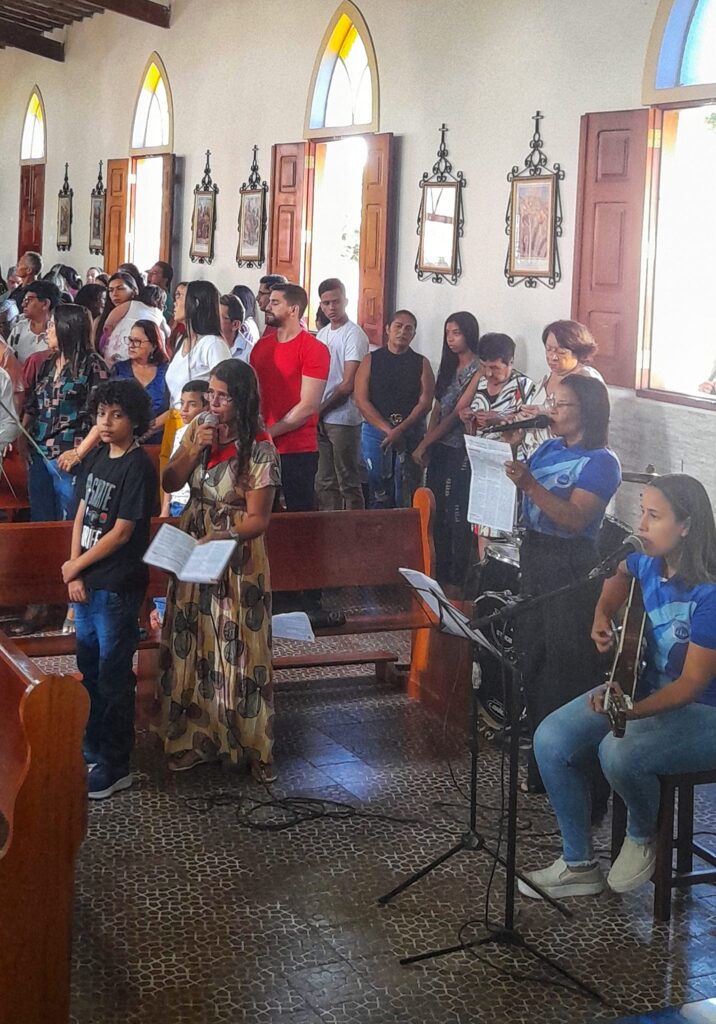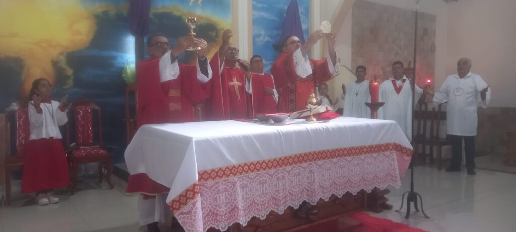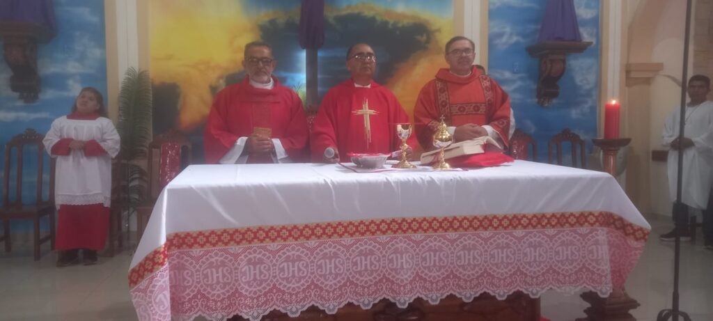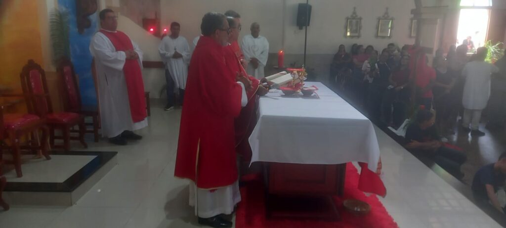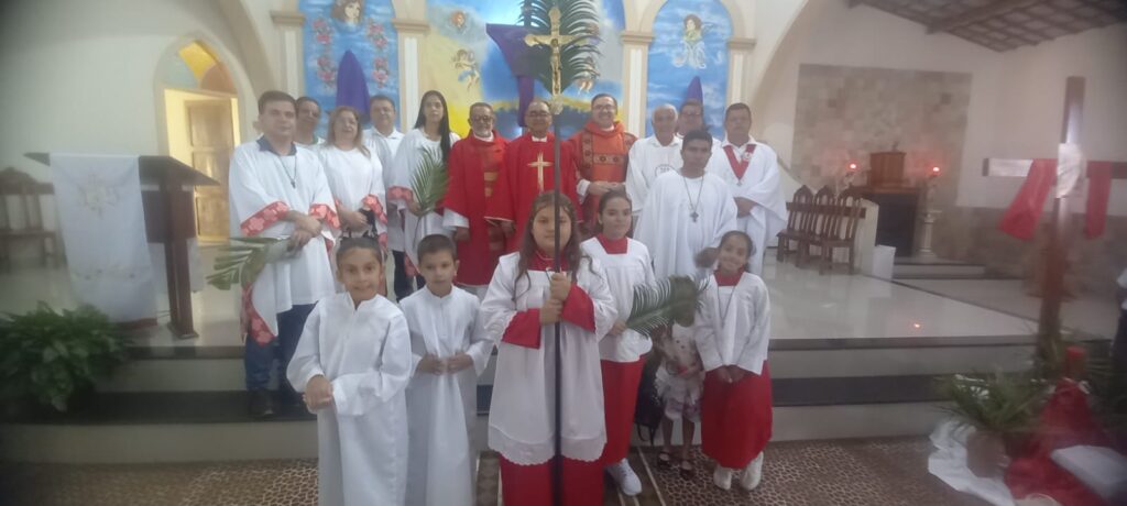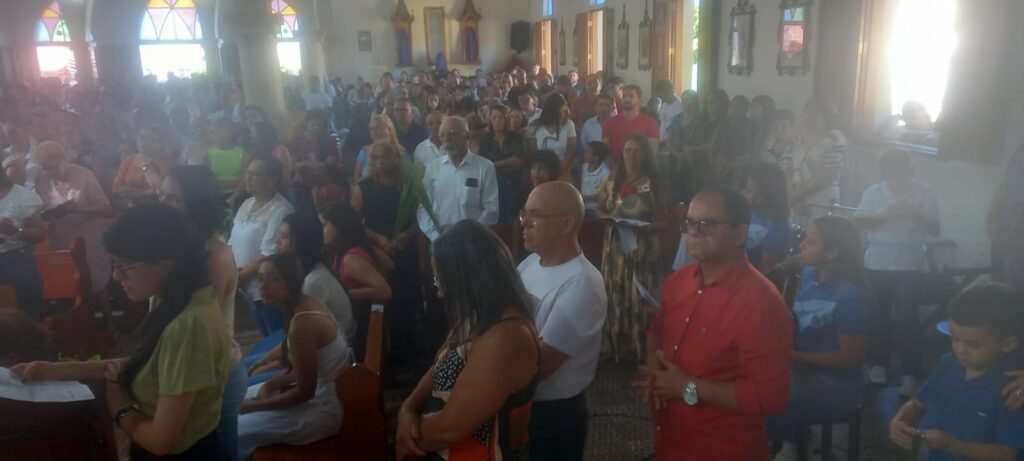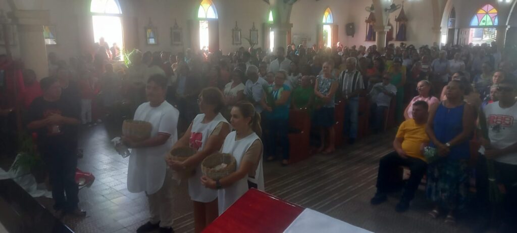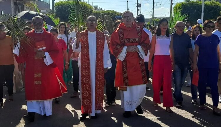 O padre Orlando presidiu a celebração com os diáconos Eduardo Oliveira e Edcarlos Soares. Cristo não é um Rei deste mundo, então o Domingo de Ramos dá o início à Semana Santa, que mistura os gritos de hosanas com os clamores da Paixão de Cristo. Naquele tempo o povo acolheu Jesus abanando seus ramos de oliveiras e palmeiras.