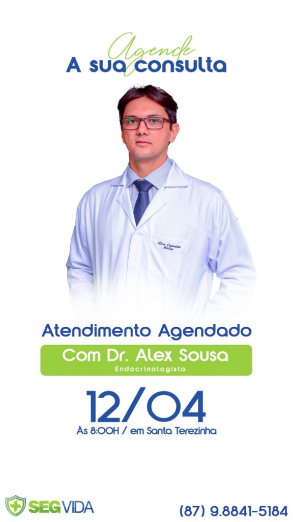 A SegVida em Santa Terezinha informa aos seus clientes e amigos que nesta sexta-feira, 12 de abril o Endocrinologista Drº Alex Sousa estará atendendo por agendamento a partir das 08:00 horas da manhã. Reserve sua consulta entrando em contato pelo número (87) 98841-5184.