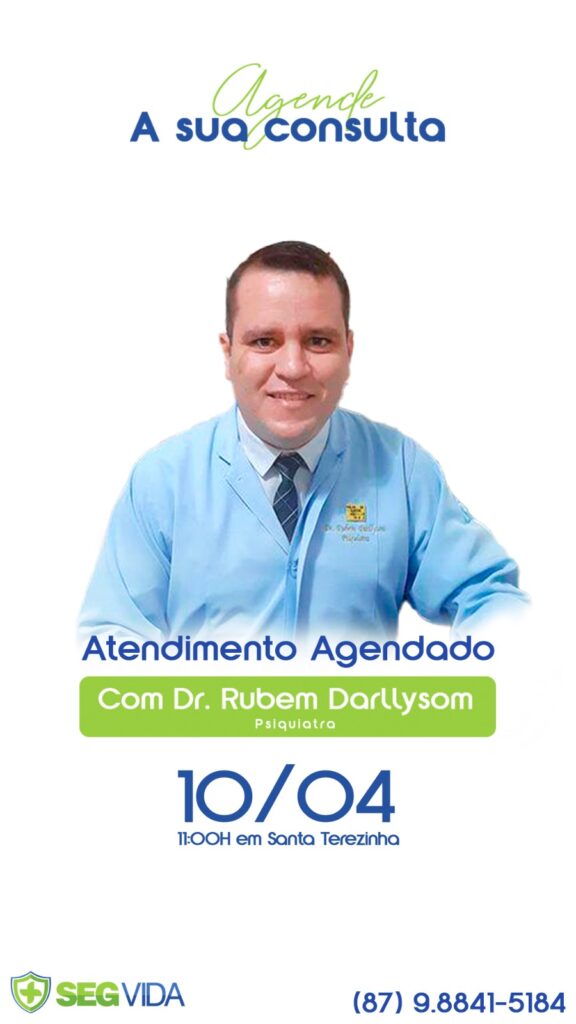 A SegVida em Santa Terezinha comunica aos seus usuários que o Psiquiatra Drº Rubem Darllysom estará atendendo por agendamento nesta quarta-feira, 10 de abril a partir das 11:00 da manhã. Reserve agora mesmo seu atendimento entrando em contato pelo número (87) 98841-5184.