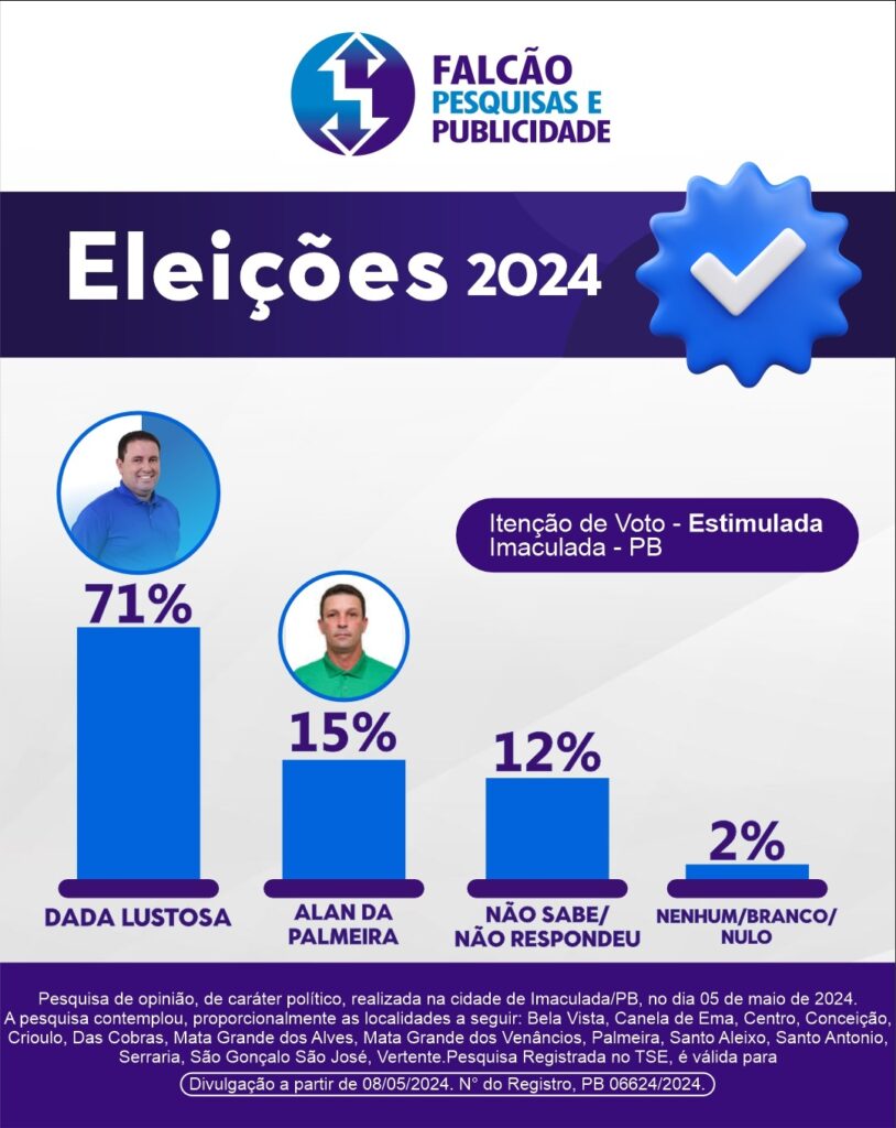 No último domingo, 05 de maio houve pesquisa eleitoral de opinião pública no Município de IMACULADA, ESTADO DA PARAIBA. A pesquisa quantitativa foi realizada por meio de entrevistas pessoais e domiciliares, utilizando questionários estruturados e padronizados, aplicados a uma amostra representativa da população alvo. A coleta de dados foi conduzida por meio de dispositivos eletrônicos, tais como smartphones e tablets.