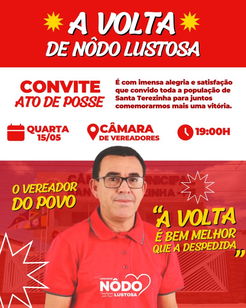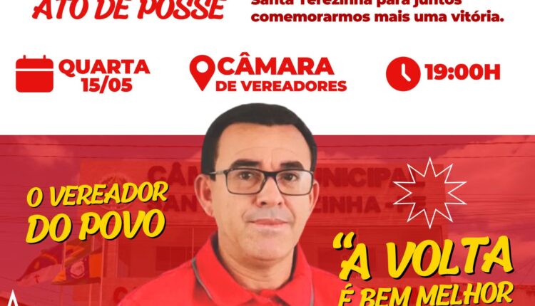 O vereador Nôdo de Gregório enviou convite para sua nova posse, retomando sua vaga como vereador na Câmara de Santa Terezinha. Ele estava afastado juntamente com André de Afonsim e Neguinho de Danda por desição judicial, porém o Juiz Dr. Carlos Henrique Rossi revogou a decisão e eles vão retornar aos cargos nesta próxima quarta-feira (15.05).