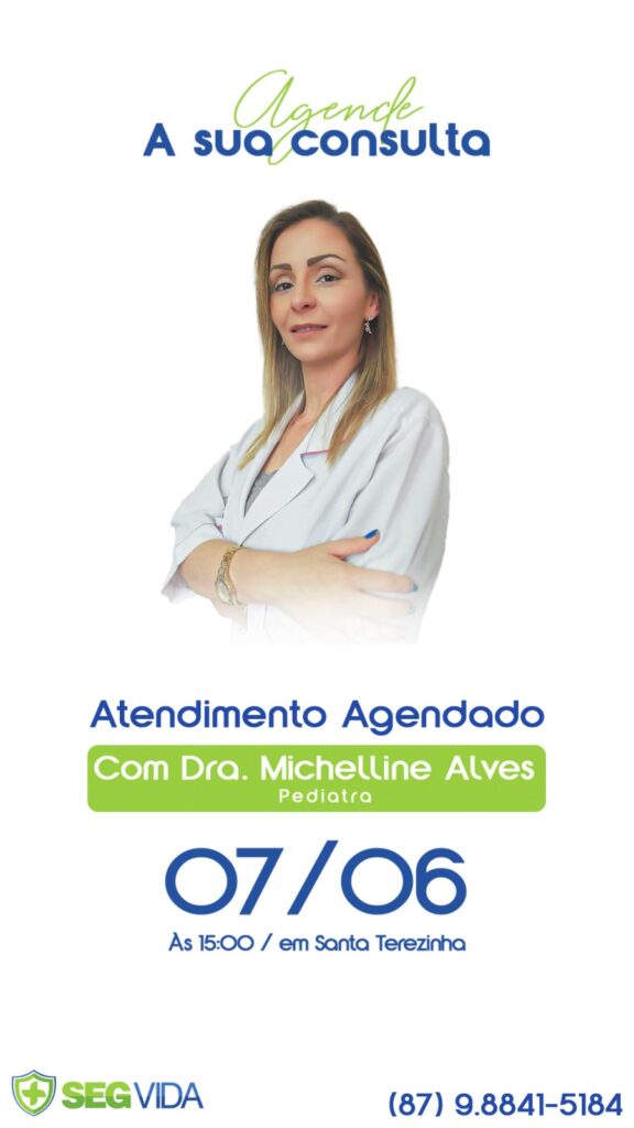 A SegVida em Santa Terezinha comunica aos seus usuários que o Pediatra Drª Michelline Alves estará atendendo por agendamento nesta sexta-feira, 07 de junho a partir das 15:00 horas. Reserve agora mesmo seu atendimento entrando em contato pelo número (87) 98841-5184.