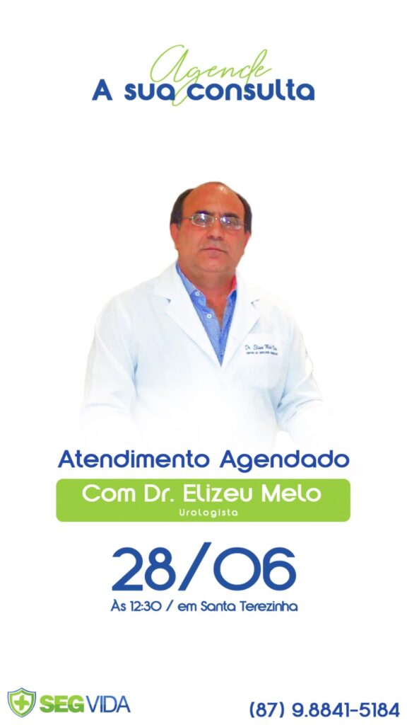 A SegVida em Santa Terezinha comunica aos seus usuários que nesta sexta-feira, 28 de junho o Urologista Drº Elizeu Melo estará atendendo por agendamento antecipado a partir das 12:30 horas. Reserve hoje mesmo sua vaga entranto em contato pelo número (87) 98841-5184.