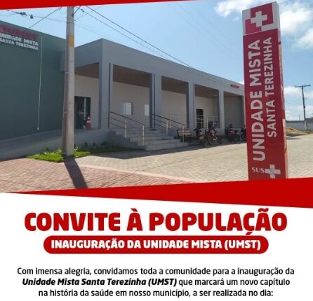A prefeitura de Santa Terezinha divulgou nessa quarta-feira, 26 de junho a inauguração da reforma e ampliação da Unidade Mista Santa Terezinha (UMST). O prefeito Delson Lustosa fez um grande investimento com verba pública para melhorar a estrutura da principal unidade de saúde Terezinhense. A inauguração está marcada para o dia 05 de julho próximo, a partir das 17:00 horas. O gestor deixou o convite extenso para toda a população participar.