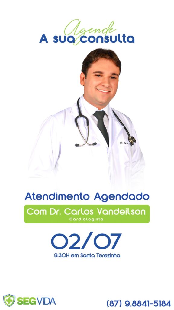 A SegVida em Santa Terezinha comunica aos seus usuários que o Cardiologista Drº Carlos Vandeilson estará atendendo por agendamento nesta terça-feira, 02 de julho a partir das 09:30 horas da manhã. Reserve agora mesmo seu atendimento entrando em contato pelo número (87) 98841-5184.