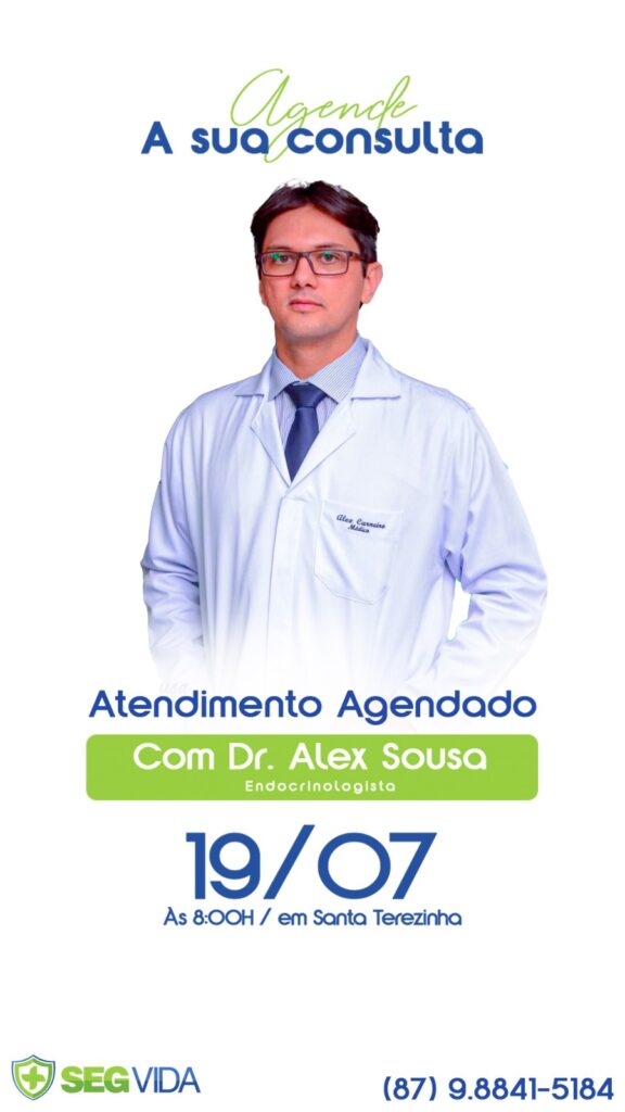A SegVida em Santa Terezinha informa aos seus clientes e amigos que nesta sexta-feira, 19 de julho o Endocrinologista Drº Alex Sousa estará atendendo por agendamento a partir das 08:00 horas da manhã. Reserve sua consulta entrando em contato pelo número (87) 98841-5184.