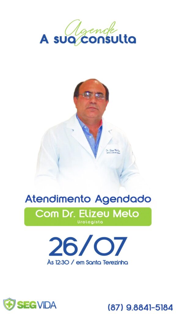A SegVida em Santa Terezinha comunica aos seus usuários que nesta sexta-feira, 26 de julho o Urologista Drº Elizeu Melo estará atendendo por agendamento antecipado a partir das 12:30 horas. Reserve hoje mesmo sua vaga entranto em contato pelo número (87) 98841-5184.