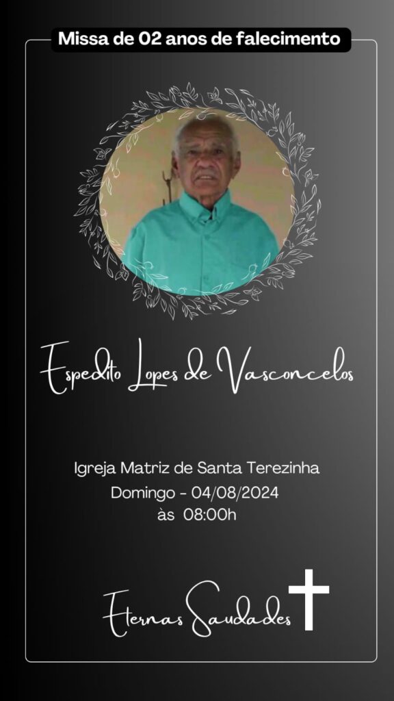 A família do saudoso Expedito Lopes de Vasconcelos (Seu Expedito) convida a todos para assistirem e participarem da missa de dois (02) de saudades, neste domingo, 04 de agosto às 08:00 horas da manhã na Matriz de Santa Terezinha. “Hoje pensamos em você com saudades no coração que se enche de tristeza e faz as lágrimas transbordarem pelos nossos olhos. Mas não há nenhuma novidade nisso, porque pensamos em você ontem e anteontem e todos os dias desde que você se foi a dois anos. Sua falta aperta tanto o coração que a saudade escorre pelos olhos”.