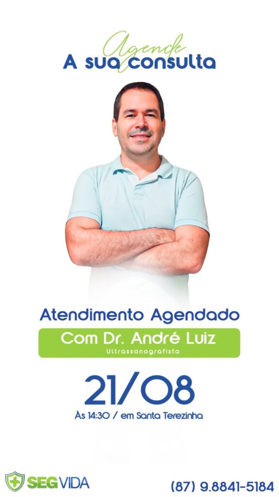 A SegVida em Santa Terezinha comunica aos seus usuários que o Ultrassonografista Drº André Luiz estará atendendo por agendamento nesta quarta-feira, 21 de agosto a partir das 14:30 horas. Reserve agora mesmo seu atendimento entrando em contato pelo número (87) 98841-5184.