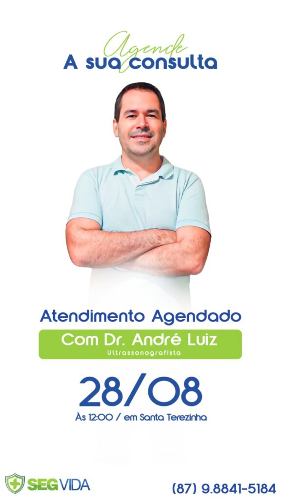 A SegVida em Santa Terezinha comunica aos seus usuários que o Ultrassonografista Drº André Luiz estará atendendo por agendamento nesta quarta-feira, 28 de agosto a partir do meio dia. Reserve agora mesmo seu atendimento entrando em contato pelo número (87) 98841-5184.