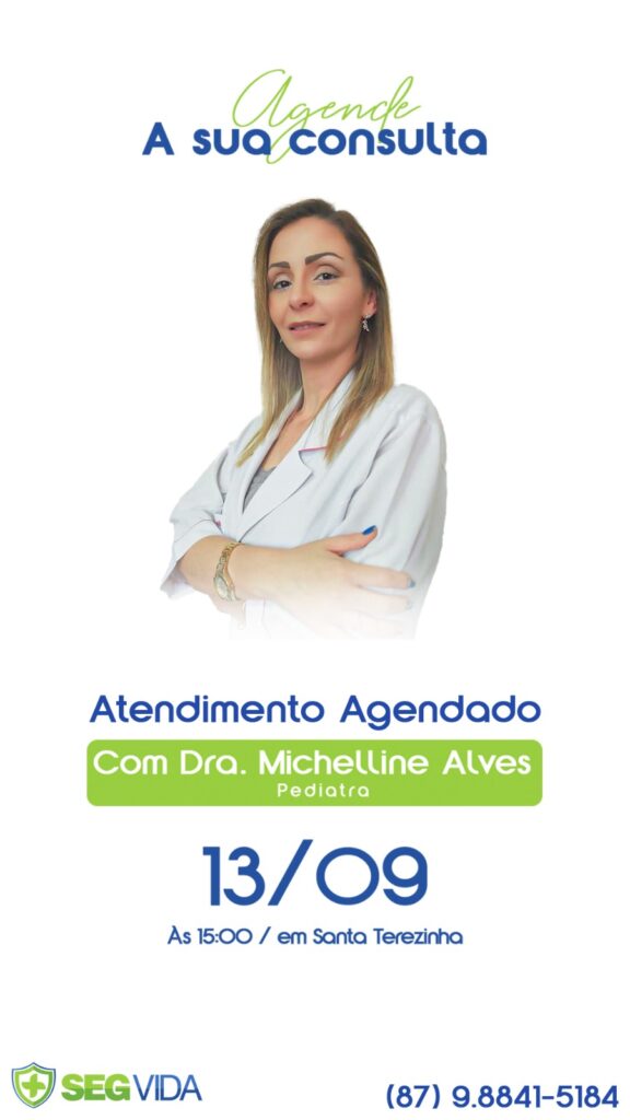 A SegVida em Santa Terezinha comunica aos seus usuários que o Pediatra Drª Michelline Alves estará atendendo por agendamento nesta sexta-feira, 13 de setembro a partir das 15:00 horas. Reserve agora mesmo seu atendimento entrando em contato pelo número (87) 98841-5184.