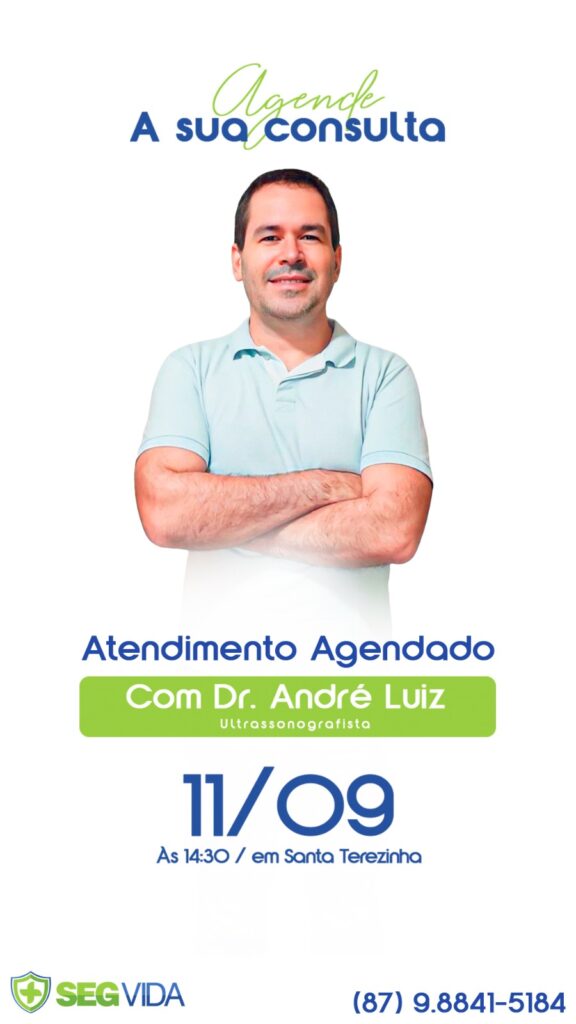 A SegVida em Santa Terezinha comunica aos seus usuários que o Ultrassonografista Drº André Luiz estará atendendo por agendamento nesta quarta-feira, 11 de setembro a partir das 14:30 horas. Reserve agora mesmo seu atendimento entrando em contato pelo número (87) 98841-5184.