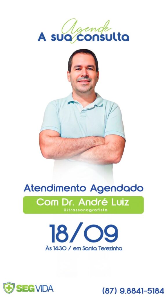A SegVida em Santa Terezinha comunica aos seus usuários que o Ultrassonografista Drº André Luiz estará atendendo por agendamento nesta quarta-feira, 18 de setembro a partir das 14:30 horas. Reserve agora mesmo seu atendimento entrando em contato pelo número (87) 98841-5184.